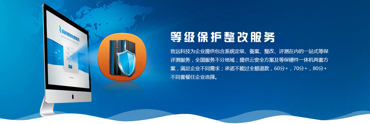 致遠(yuǎn)等保服務(wù)全國(guó)不分地域,企業(yè)只需提供基本資料,其他事項(xiàng)均由我方一站式負(fù)責(zé)(定級(jí)、備案、技術(shù)文案、整改實(shí)施、等保評(píng)測(cè)等)。安全防護(hù)方案中,云安全方案或等保硬件一體機(jī)兩套方案任選,滿(mǎn)足大中小型企業(yè)不同需求。承諾不通過(guò)全額退款,為企業(yè)定制70分+,80分+,90分+不同套餐方案,滿(mǎn)足企業(yè)對(duì)安全防護(hù)的不同要求。
