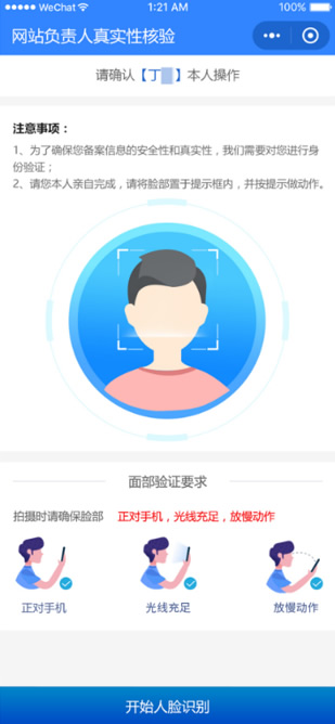 一般為對網(wǎng)站負(fù)責(zé)人進(jìn)行“人臉識別”、“唇語識別”、“動作識別”等技術(shù)手段采樣,電子化核驗(yàn)系統(tǒng)將與權(quán)威庫進(jìn)行信息比對及核驗(yàn),檢驗(yàn)網(wǎng)站負(fù)責(zé)人的真實(shí)性。 |