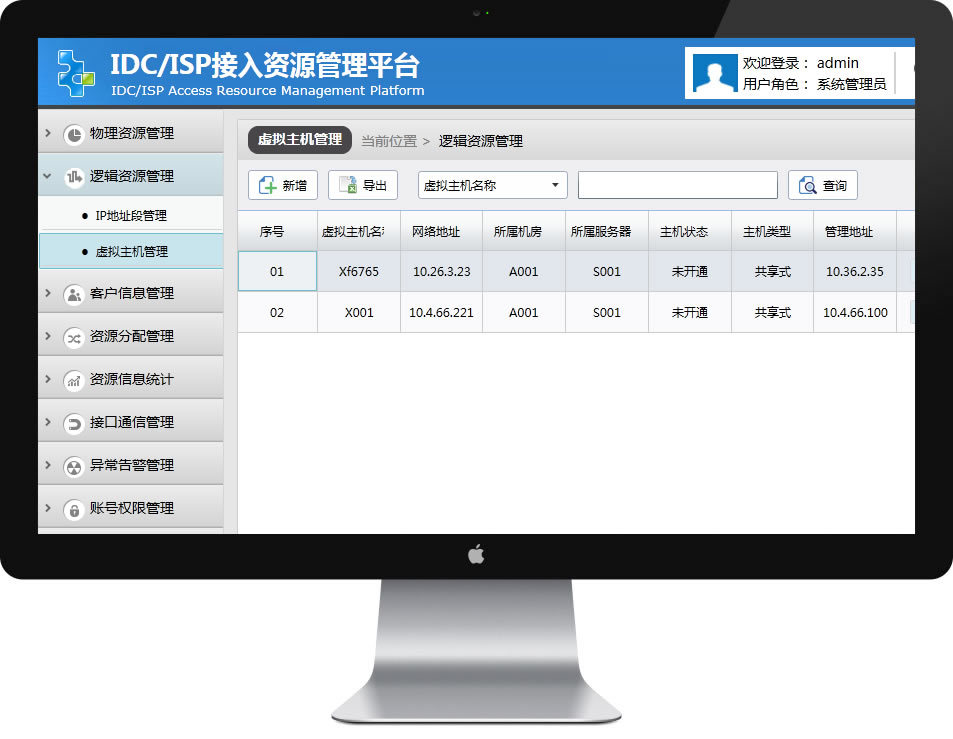 接入資源管理平臺(tái)可以對(duì)邏輯資源進(jìn)行管理,包括但不限于如下操作: a)對(duì)IP地址段進(jìn)行新增、刪除、修改、查看、預(yù)留和分配等操作。 b)對(duì)虛擬主機(jī)進(jìn)行開啟、關(guān)閉、新增、刪除、修改和查看等操作。 |